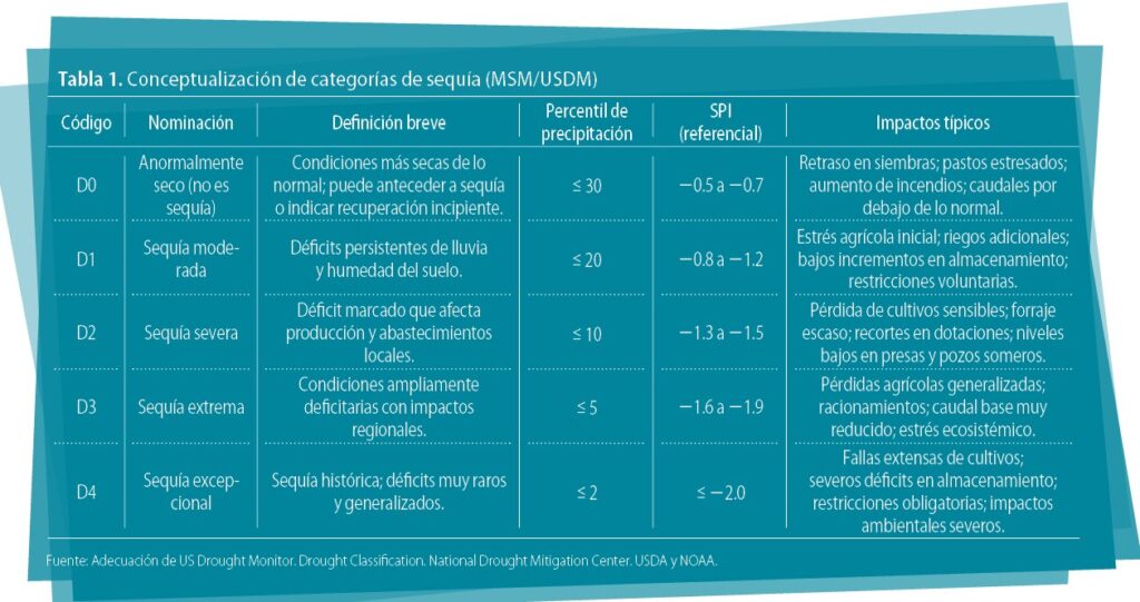 Entre 2013 y 2023, México presentó una alta variabilidad en la ocurrencia e intensidad de sequías. La superficie nacional afectada fluctuó entre 10 y 15% del territorio (categorías D1-D4), alcanzando un máximo del 76% en 2021, con una persistencia media a alta durante 2022 y 2023 (superior al 53%). En los años más secos, predominó la expansión de las sequías moderadas a severas (D1-D2), coexistiendo con núcleos localizados de sequía extrema o excepcional (D3-D4) (tabla 1).