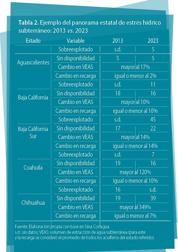 Entre 2013 y 2023, la situación de los acuíferos en México se volvió más crítica. Según datos del Sistema Nacional de Información del Agua de la Comisión Nacional del Agua (Sina Conagua), los acuíferos sin disponibilidad aumentaron de 193 a 283, y 114 se encuentran en sobreexplotación. De ellos, 107 coinciden en ambas categorías, mientras que siete mantienen disponibilidad administrativa pese a estar sobreexplotados, lo que evidencia un desacoplamiento entre la gestión y la realidad física del sistema.