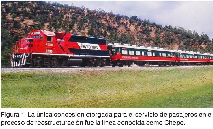 A la fecha, el éxito de este proceso es contundente: se han modernizado las vías férreas, las instalaciones y el equipo, con inversiones acumuladas cercanas a los 14,000 millones de dólares y se han implantado procesos de operación, gestión y explotación eficientes, lo que ha permitido mejorar el servicio y con ello duplicar el volumen de transporte ferroviario para mover actualmente el 26% del transporte terrestre de carga del país. Sin embargo, el servicio de pasajeros no ha tenido la misma dinámica, debido a que durante el proceso de reestructuración se determinó que este no se justificaba ni económica ni socialmente, por lo que solo se otorgó la concesión al Ferrocarril Pacífico Norte (hoy Ferromex) para la prestación del servicio público de transporte ferroviario de pasajeros en la línea Chihuahua-Topolobampo, conocido como Chepe (figura 2). A 25 años de las concesiones, se han desarrollado ciertos servicios de pasajeros, como el Suburbano Buenavista-Cuautitlán, el tren turístico Puebla-Cholula y, recientemente, proyectos de mayor envergadura, como el Tren Interurbano México-Toluca y el Tren Maya.