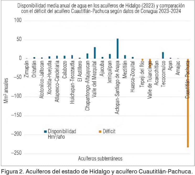 Los acuíferos con mayor disponibilidad de agua en el estado de Hidalgo son Valle del Mezquital, con una disponibilidad media anual de 30.462 Hm3/año (millones de metros cúbicos por año), equivalentes a 0.965 m3/s, y el acuífero Actopan Santiago de Anaya, con una disponibilidad media anual de 53.144 Hm3/año, equivalentes a 1.684 m3/s (figura 1).