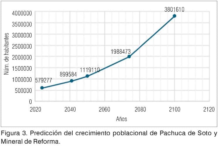 Pachuca y Mineral de la Reforma son las dos ciudades más grandes del estado de Hidalgo y se encuentran conurbadas. Su crecimiento poblacional va en aumento, de acuerdo con los censos de población oficiales del Inegi; con los cálculos de predicción se estima que para 2041 la población de estos dos municipios conurbados será de 899,584 habitantes, y para 2050 se calcula una población de 1,119,110 habitantes, sin considerar a la zona metropolitana de Tizayuca (figura 3).
