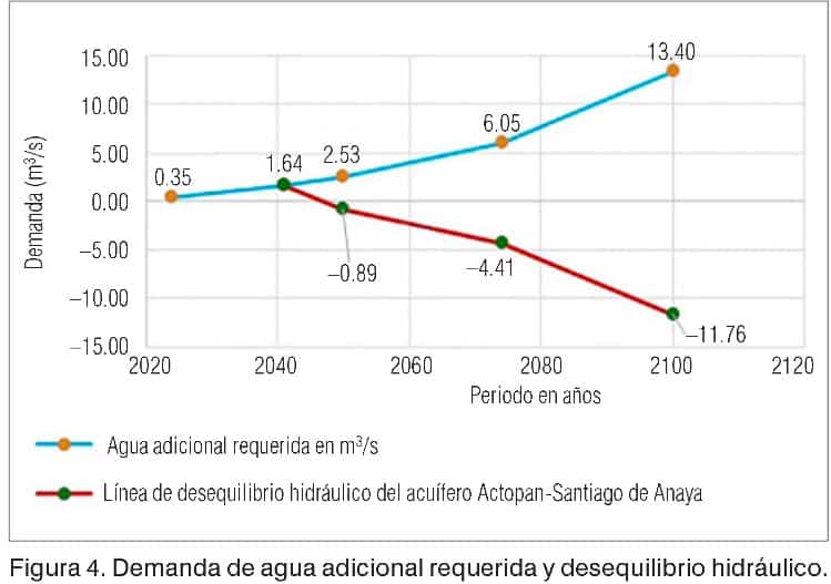 En este escenario de predicción matemática, y suministrando agua a la zona metropolitana de Pachuca, el acuífero Actopan-Santiago de Anaya estará en un punto de equilibrio hidráulico. Para el año 2050 se requerirán 2.53 m3/s adicionales y sucesivamente se incrementará la demanda de agua conforme crezca la población (tabla 1).