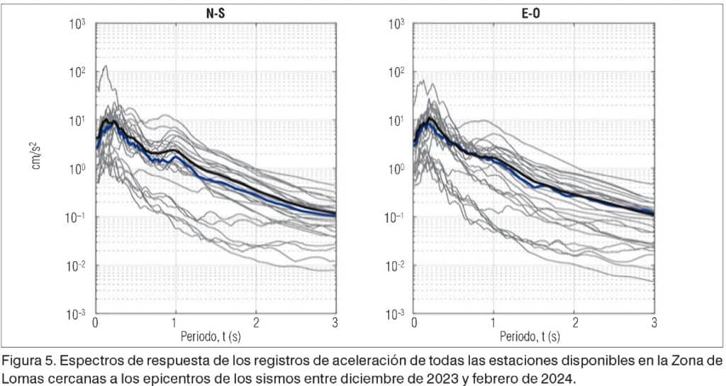 Los resultados preliminares que se presentan requieren, sin duda, una serie de exploraciones para determinar la estructura geológica y geofísica de la zona, y de ser necesario estimar la magnitud potencial de la falla o segmentos de falla presente en los alrededores. Los niveles de intensidad que pueden presentarse, y que finalmente son los valores que utilizamos en el diseño de edificaciones –cabe destacar que los desplazamientos diferenciales alrededor de la grieta son aparentemente los responsables de algunos de los daños reportados–, serán producto de trabajos posteriores. Sin embargo, a manera de preámbulo se muestran en la figura 5 los espectros de respuesta de todos los registros de los sismos en la Zona de Lomas junto con la media y la mediana, en azul y negro, respectivamente. Salvo en un caso, los registros arrojan valores relativamente bajos de aceleración espectral, cuando se comparan con el espectro de peligro uniforme de la norma por sismo de la Ciudad México, pero fueron percibidos por la población y en uno de los casos fue muy alto para periodos cortos.