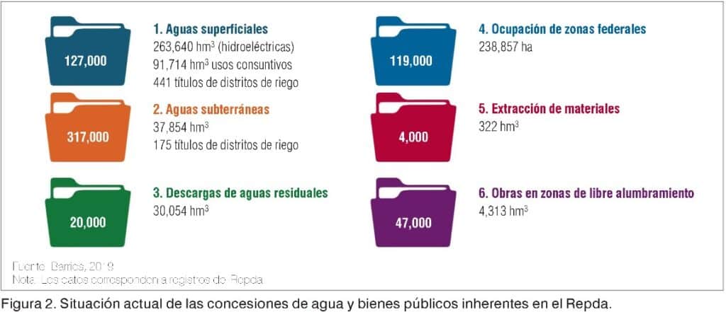 En nueve años (1994-2002) se integró alrededor del 70% del padrón actual. De 2002 a 2019, se integró el restante 30% de registros, que corresponden a 194,000 títulos. De 2019 a la fecha, el Registro Público de Derechos de Agua (Repda; Conagua, 2024) se ha incrementado en 27,000 concesiones de agua (figura 1).