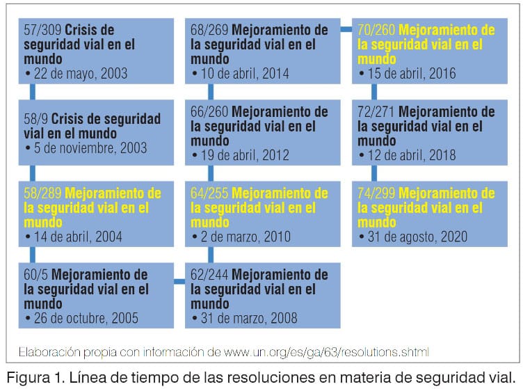 El trabajo para llegar a conocer el tamaño estimado de la problemática que representan los hechos viales ha sido arduo y constante. Cabe revisar la línea de tiempo de las resoluciones que en esta materia han emitido los organismos que lideran el tema (véase figura 1). Entre ellas destacan la 58/289 Mejoramiento de la seguridad vial en el mundo, fechada el 14 de abril de 2004, donde cambia la perspectiva para ya no hablar de la crisis de seguridad vial en el mundo sino del mejoramiento de la seguridad vial en el mundo, y donde se presentan datos duros de las estadísticas globales que evidencian estos hechos como una callada pandemia de la cual no hemos sido muy conscientes. Otra resolución importante fue la 64/255, a partir de la cual se declara el Primer Decenio de Acciones por la Seguridad Vial (2011-2020). La más reciente, 74/299, de fecha 31 de agosto de 2020, estableció el Segundo Decenio de Acciones por la Seguridad Vial.