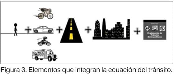 No es difícil detectar dónde estaría la intervención de los ingenieros, pues la medida relativa a infraestructura vial segura es de toda su incumbencia, sin hacer de lado que, por ejemplo, al menos en otras tres de ellas se puede influir en mayor o menor medida. Recordemos que en la ecuación más básica del tránsito, los elementos que la conforman nos comprometen a considerar sus requerimientos de forma sistémica (véase figura 3).