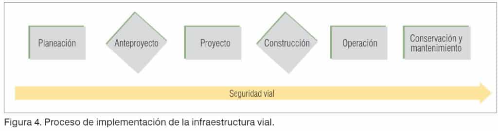 Es importante destacar que los niveles de actuación de los ingenieros en la seguridad vial están, en estricto sentido, en todas las etapas de implementación de las redes viales, y en general en el desarrollo de los sistemas de transporte (véase figura 4).