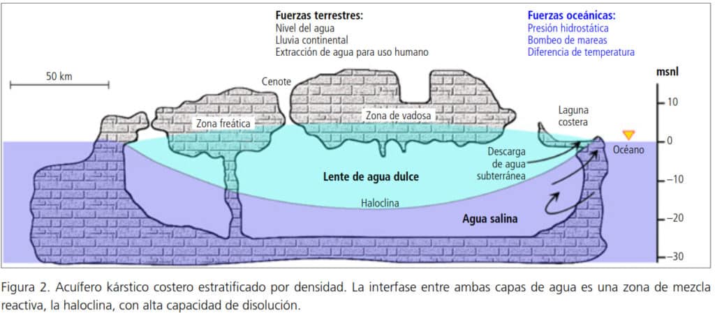 En la interfase de capas dulce y salada (haloclina) existe un gradiente de temperatura y salinidad y, sobre todo, diferencias en la saturación de CO2 que le proporcionan un poder corrosivo mayor hacia la roca caliza. Al bucear en las cuevas es posible observar que sobre la haloclina los pasajes generalmente son más anchos, una señal de que la disolución es mayor en esa zona y que es un proceso en continuo desarrollo.