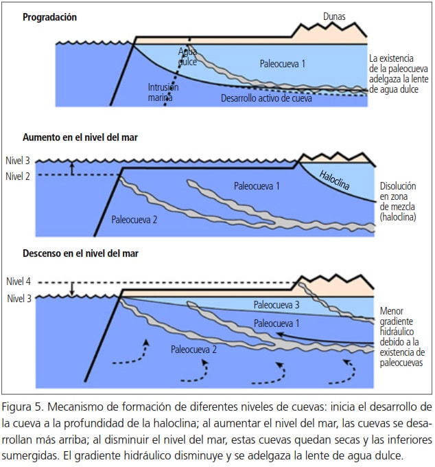 Sabiendo que la mayor disolución ocurre en la zona de mezcla entre el agua dulce y salada, la cual sube o baja dependiendo del nivel del mar, se puede entender la razón por la cual existen diferentes niveles de cuevas a distintas profundidades. Al cambiar el nivel del mar, la haloclina se desplaza y empieza a disolver la roca a diferente profundidad, con lo que empieza otro “nivel” de cuevas.