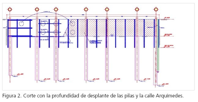 Un caso fue la construcción en la Ciudad de México de un edificio habitacional de 12 niveles, planta baja y dos sótanos, ubicado en la calle Arquímedes, en la colonia Polanco. La cimentación consistió en pilas de 80 cm y 100 cm de diámetro (figura 2); en el eje paralelo y adyacente a la calle Arquímedes, la profundidad de desplante de las pilas era de 32 m. Al perforar uno de estos elementos, se encontró un obstáculo en la cota –27 m a partir del nivel de banqueta, por lo que se suspendió la perforación y se rellenó con suelo-cemento, con el propósito de que no quedara abierta mientras se revisaba la información contenida en la exploración geotécnica. Se decidió realizar otra perforación sobre el mismo eje, en el trazo más alejado a la perforación rellenada, pero no fue posible avanzar por encontrarse otro obstáculo en la misma profundidad, por lo que se rellenó con el mismo criterio. Después de revisar la información disponible e identificar que los obstáculos encontrados eran muy resistentes y no se desplazaban en ninguna dirección con diferentes herramientas de perforación, se concluyó que lo que se intentaba atravesar era la bóveda de la línea 7 del metro –recuérdese que es la línea más profunda del metro de la Ciudad de México–, cota que coincidía exactamente con los 27 m alcanzados en los dos trazos mencionados. Se resolvió la cimentación recortando la longitud de las pilas del eje adyacente a la calle Arquímedes a 20 m de profundidad y construyendo pilas adicionales en el siguiente eje con una profundidad de 26 m.