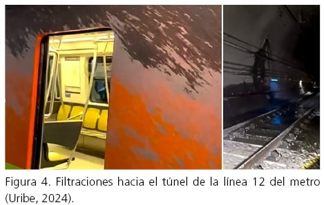 Recientemente, Uribe (2024) señaló una filtración y afectación a la bóveda del túnel de la línea 12 del metro (figura 4). En primera instancia, se determinó que esto se debió a la perforación de pilas de cimentación que se efectuaba en una obra ubicada arriba del trazo del túnel.