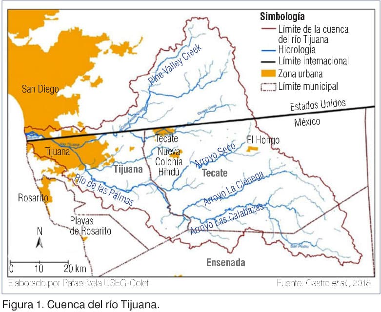 El río Tijuana está formado por diferentes corrientes originadas en México y Estados Unidos, principalmente el río de Las Palmas en México y el Cottonwood Creek en la parte estadounidense de la cuenca. Ambos afluentes convergen en la zona urbana de la ciudad de Tijuana, 16 km al este del océano Pacífico, y desemboca en el mar, cerca de una reserva ecológica al norte de la línea fronteriza (figura 1).