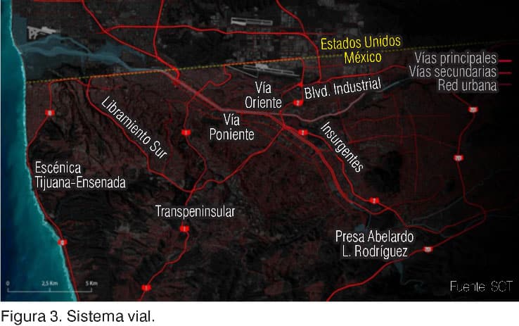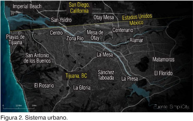 El río Tijuana en su tramo urbano atraviesa la ciudad desde la presa Abelardo L. Rodríguez, en la parte sur, hasta el cruce fronterizo de San Isidro, con una infraestructura canalizada sin ningún valor ecológico ni social (figura 2). Sin embargo, históricamente el río ha tenido siempre una presencia urbana notable, al ser el gran eje que ha estructurado el crecimiento de Tijuana hacia la parte sur. Junto a él se localiza el centro y la mayor parte de las zonas comerciales y de servicios y, al estar confinado por dos vías rápidas, también es un eje que vertebra la movilidad a lo largo de la ciudad (figura 3).