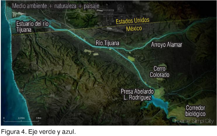 El eje verde y azul (figura 4) propone recuperar el río y convertirlo en un gran corredor ecológico de carácter metropolitano, conectando la presa Abelardo L. Rodríguez, el arroyo Alamar, el cerro Colorado y el estuario en la desembocadura del río en el océano Pacífico. Es una operación para conformar un gran parque lineal en el centro de la ciudad que actúe como pulmón verde y espacio de ocio. Sus acciones destacadas son: