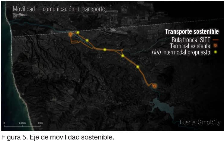 El eje de movilidad sostenible (figura 5) tiene por objetivo conectar la ciudad de forma limpia y eficiente articulando una red de transporte multimodal que integre el río con los sistemas de transporte público, ciclismo y movilidad peatonal. Sus propuestas concretas son: