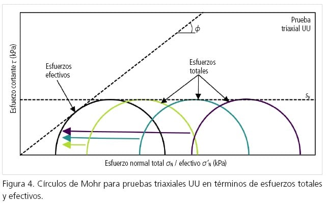 Considerando lo expuesto, parece redundante ejecutar tres pruebas triaxiales UU a diferentes confinamientos de una cierta muestra de suelo. Teóricamente, una única prueba, incluso en compresión simple, debería resultar en el mismo valor de su. Sin embargo, existen motivos válidos para realizar los tres ensayos usuales a diferentes confinamientos. Por ejemplo, el muestreo puede derivar en la apertura de fisuras preexistentes que reducen la resistencia al corte. En este caso, la aplicación de un cierto nivel de confinamiento permite cerrar dichas fisuras y obtener una resistencia más consistente con el suelo in situ (Craig, 2004). Asimismo, nos permite identificar situaciones donde no se obtiene una envolvente de resistencia horizontal, como en la figura 5, que podría sugerir que la prueba UU no es aplicable a este material. Este último aspecto se discute en la sección 5.