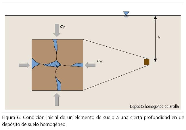 Asumamos un depósito homogéneo, con un nivel freático superficial y una distribución hidrostática de la presión de poro, en donde consideramos un elemento de suelo a una cierta profundidad h, como se muestra en la figura 6. El elemento de suelo está sometido a un cierto estado de esfuerzos total y a una cierta presión de poro, esto es, a un cierto estado de esfuerzos efectivo. Ahora supongamos que podemos realizar un muestreo perfecto, donde removemos de forma instantánea el esfuerzo total y la presión de poro actuando en el contorno del elemento (cosa que, por supuesto, no es posible). También asumamos una condición no drenada perfecta, donde no se permiten cambios de volumen. En este caso, la remoción del esfuerzo total en el contorno del elemento resulta en una tendencia del material a expandirse, es decir, una tendencia de las partículas de suelo a alejarse unas de otras. Sin embargo, como asumimos una condición sin cambio de volumen, esta tendencia del suelo a expandirse genera una relajación del agua en los poros y, por ende, una reducción de su presión inicial. Si el suelo está saturado, esta reducción de presión de poro ∆u será aproximadamente igual a la reducción del esfuerzo medio total ∆p que resulta del muestreo. Por lo tanto, el esfuerzo medio efectivo p̕ permanece constante. Esto es análogo a lo que ocurre cuando incrementamos el confinamiento sin permitir el drenaje en una prueba UU, pero en este caso corresponde a una descarga y a una disminución de la presión de poro.