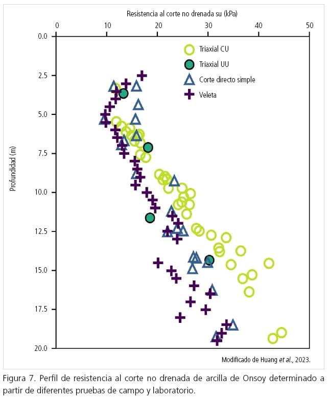 Si realizamos una prueba UU a nuestro elemento de suelo, obtendremos la resistencia al corte no drenada asociada con el esfuerzo medio efectivo de consolidación p̕0 a la profundidad que se encontraba in situ. De hecho, esta es la hipótesis que asumimos en el ensayo UU; la resistencia no drenada determinada es la del suelo in situ, a la profundidad de donde se extrajo la muestra. Haciendo pruebas en muestras extraídas de diferentes profundidades obtenemos el perfil de resistencia al corte no drenada del depósito, donde, según lo discutido en la sección 3, su debe aumentar con la profundidad; un hecho ampliamente documentado en la bibliografía (véase, por ejemplo, la figura 7).